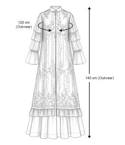 A luxurious two-piece gown crafted from intricate floral embroidered lace layered over a soft inner dress (two piece of inner and outwear). Designed with a sleek stand collar and elegant front button detailing, this piece is elevated by sheer flared sleeves that create graceful movement. The vertical embroidery and tiered lace–tulle hem enhance its flowing silhouette, delivering an effortlessly luxurious look. Perfect for festive occasions, formal events, and elegant celebrations.