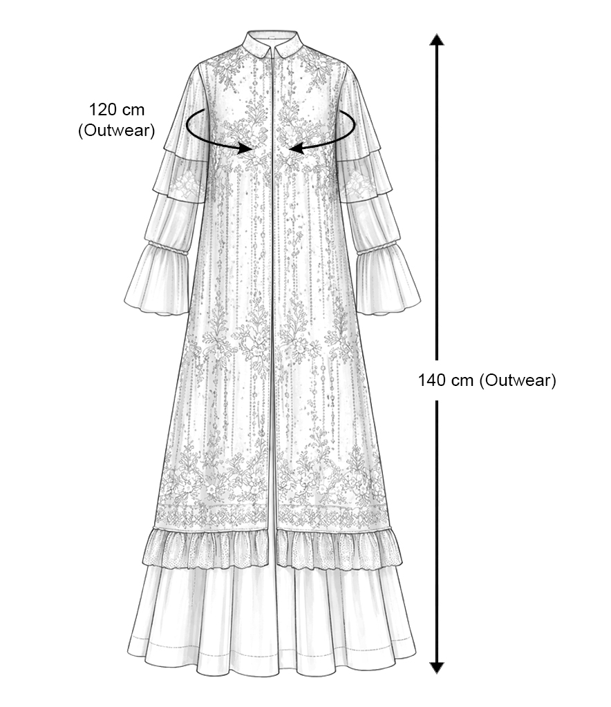 An elegant two piece (inner and outwear) statement gown designed for graceful celebrations, crafted from intricate embroidered lace layered over a soft inner dress. Featuring a refined stand collar with a concealed button placket, this gown is elevated by airy sheer sleeves finished with gentle flare details that add movement and romance. The delicate floral embroidery is subtly accented with a soft sheen, while the tiered tulle hem creates a flowing, ethereal silhouette. Feminine, polished, and timeless, the Mirelle Embroidery Gown is perfect for festive occasions, formal events, and special moments that call for understated luxury.