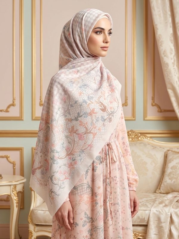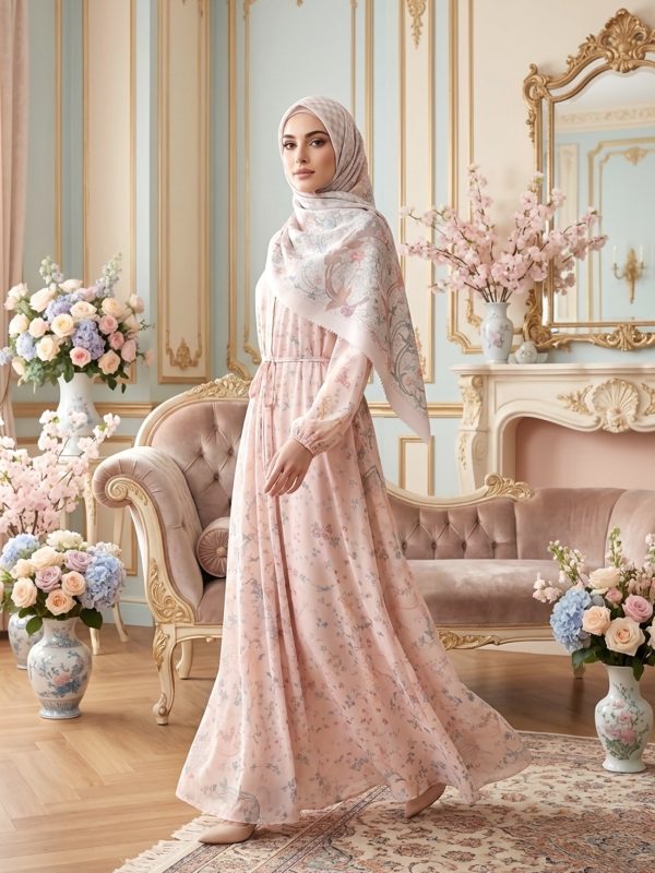 With Exclusive Custom Prints from Alkhansas, this is a refined Rococo and Arabesque–inspired dress and scarf set crafted for elegant Raya moments. Made from premium satin with a soft luminous drape, the dress features a custom ornamental print and delicate beadwork on the right chest for subtle sparkle. Paired with a lightweight voile scarf, this set offers timeless grace, comfort, and artistic elegance.