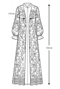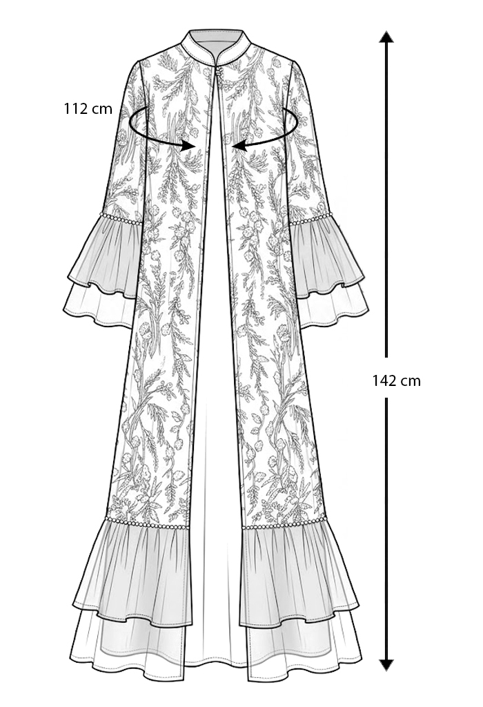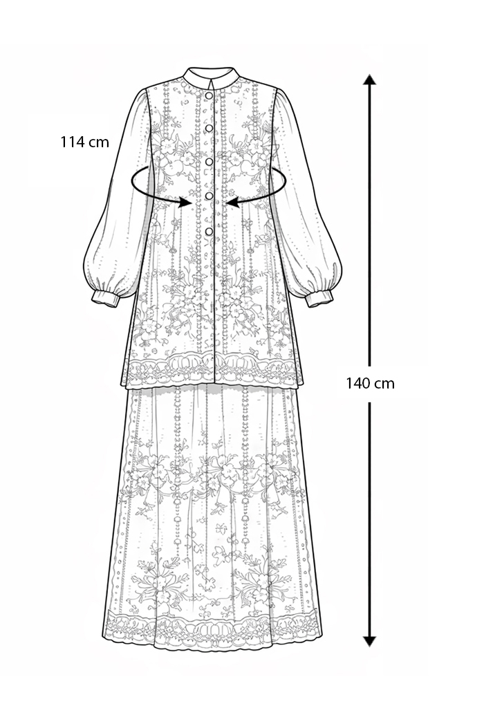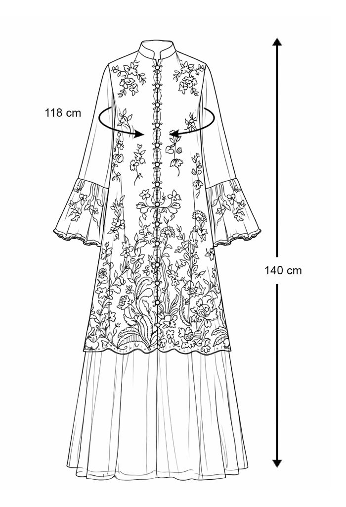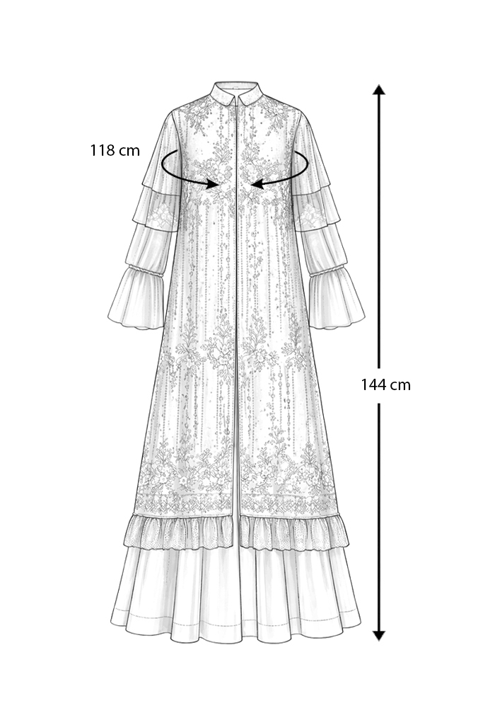 A luxurious two-piece gown crafted from intricate floral embroidered lace layered over a soft inner dress (two piece of inner and outwear). Designed with a sleek stand collar and elegant front button detailing, this piece is elevated by sheer flared sleeves that create graceful movement. The vertical embroidery and tiered lace–tulle hem enhance its flowing silhouette, delivering an effortlessly luxurious look. Perfect for festive occasions, formal events, and elegant celebrations.