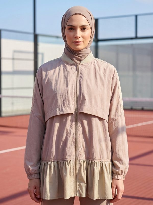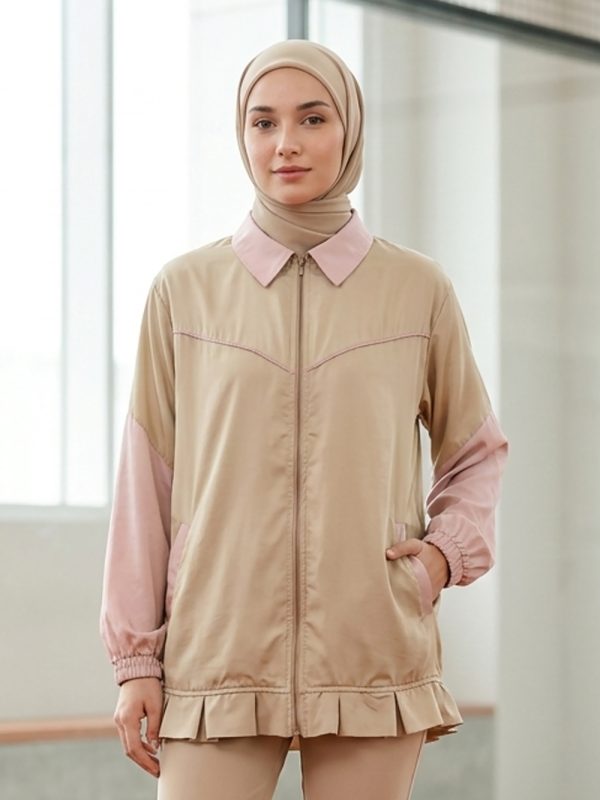 A refined everyday athleisure jacket crafted from soft, breathable fabric. The pastel floral-bow print is paired with geometric sleeves, creating a subtle yet artful contrast. Designed with a clean collar, front zipper, and a gently gathered waist that drapes into an elegant, fluid silhouette. Finished with elastic sleeves for effortless comfort. A versatile statement piece that brings quiet sophistication to any look.