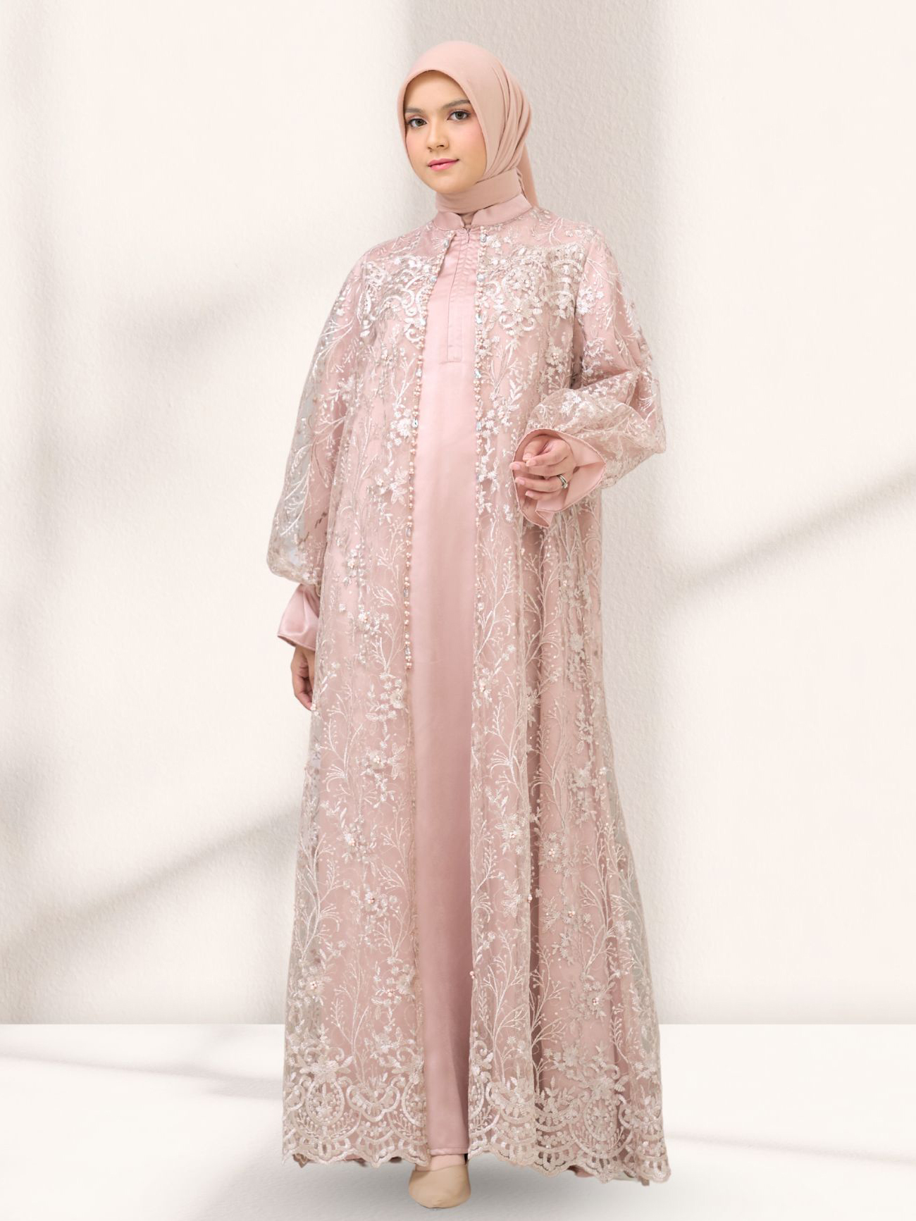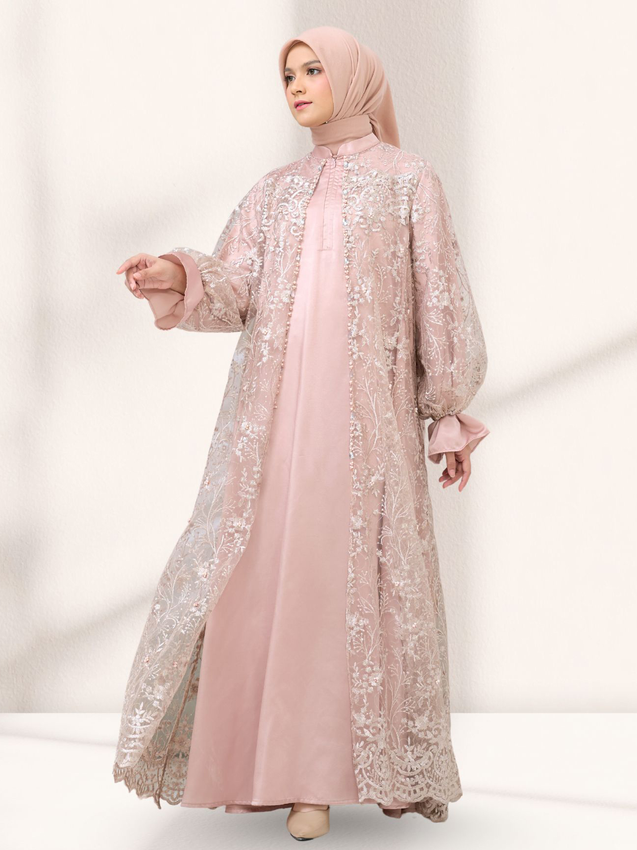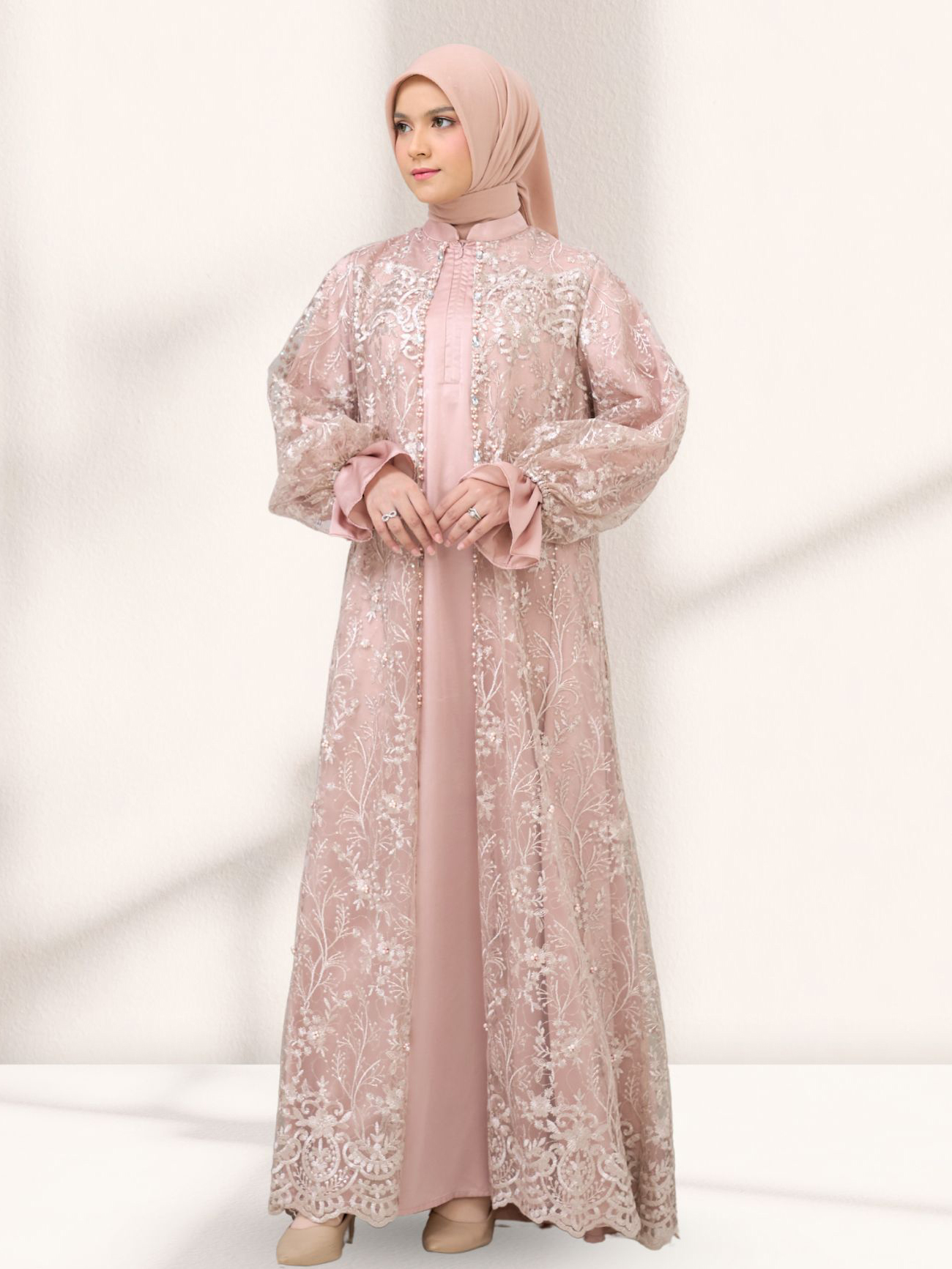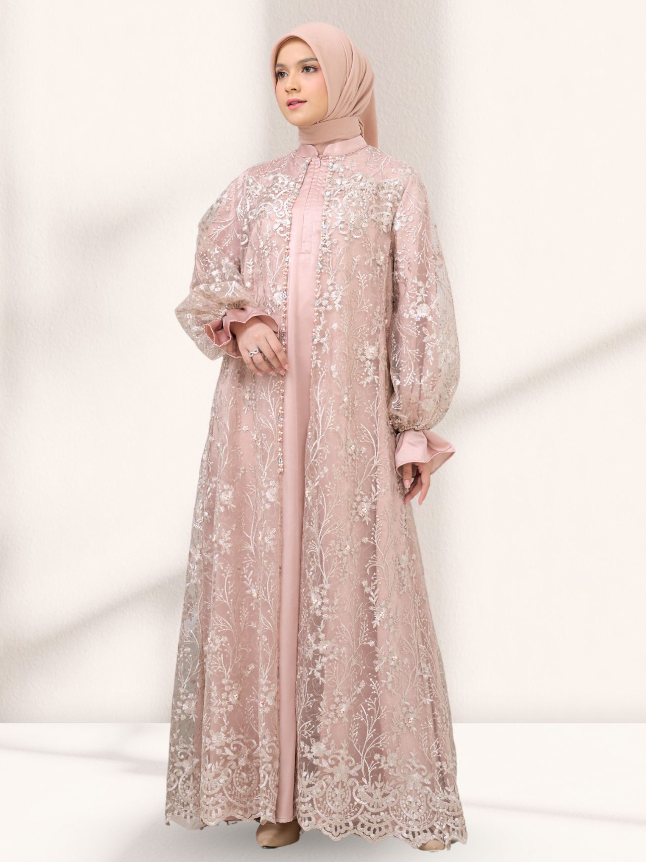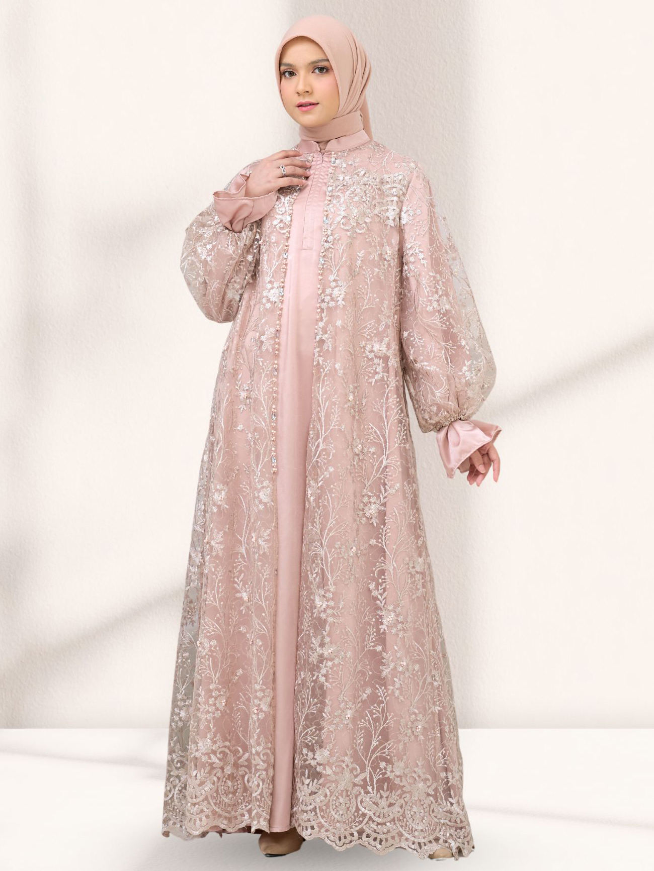 A delicate special-occasion gown crafted from luxurious embroidered lace with soft shimmering accents. Designed with a refined stand collar, a smooth hidden button placket, and gracefully puffed sleeves that enhance the romantic silhouette. The floral lace overlay flows beautifully over the inner dress, creating depth, elegance, and an effortlessly ethereal look. Completed with a scalloped hem and subtle embellishments, this gown evokes timeless femininity—perfect for festive moments, formal gatherings, and cherished celebrations.