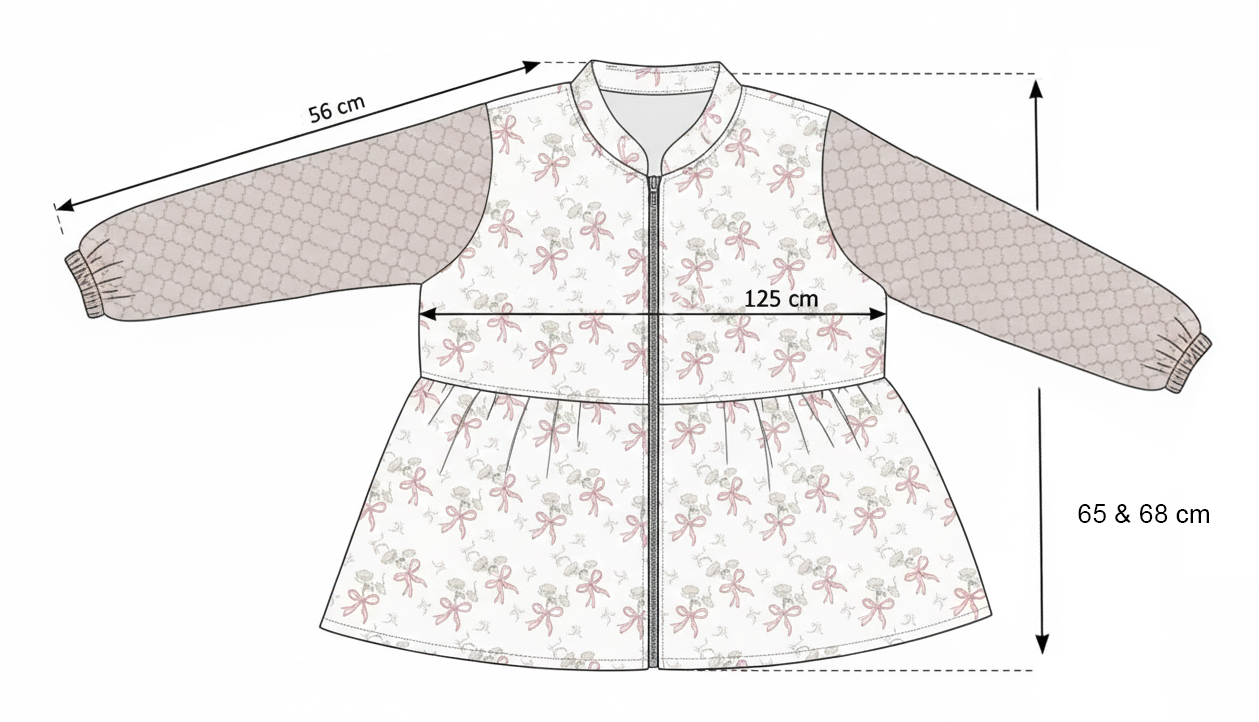 A refined everyday athleisure jacket crafted from soft, breathable fabric. The pastel floral-bow print is paired with geometric sleeves, creating a subtle yet artful contrast. Designed with a clean collar, front zipper, and a gently gathered waist that drapes into an elegant, fluid silhouette. Finished with elastic sleeves for effortless comfort. A versatile statement piece that brings quiet sophistication to any look.