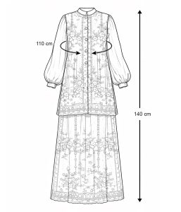 A luxurious two-piece gown crafted from intricate floral embroidered lace layered over a soft inner dress (two piece of inner and outwear). Designed with a sleek stand collar and elegant front button detailing, this piece is elevated by sheer flared sleeves that create graceful movement. The vertical embroidery and tiered lace–tulle hem enhance its flowing silhouette, delivering an effortlessly luxurious look. Perfect for festive occasions, formal events, and elegant celebrations.
